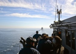 Le croiseur USS Leyte Gulf s’approche de la Marne en vue d’un ravitaillement à la mer.