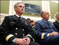 A gauche, le vice-amiral Bruce MacLean et à droite le général Ray Henault, chef d’état-major des armées