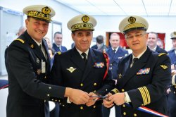 Le contre-amiral Olivier Coupry, commandant la force maritime des fusiliers marins et commandos, et commandant la marine à Lorient (au centre) avec le commissaire général de 2ème classe Vincent Campredon, commandant le groupement de soutien de la base de Défense Brest-Lorient et le capitaine de vaisseau Bertrand Mistler, commandant la BAN Lann-Bihoué inaugure le nouveau centre de restauration de la base aéronautique navale de Lann-Bihoué