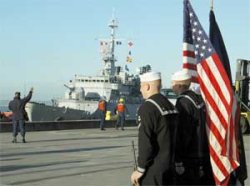 La garde des couleurs de l’USS Ford se prépare alors que Le Prairial arrive à Seattle le 16 novembre dernier. Photo : US Navy, tous droits réservés.