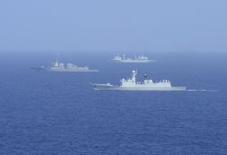 Le USS Sterett, à gauche, lors d’un exercice de lutte contre la piraterie dans le golfe d’Aden, le 11 décembre 2014. Il navigue avec 2 navires chinois la frégate Yun Chang (classe Jiangkai II), à droite, et le pétrolier-ravitailleur Chao Hu (à gauche).