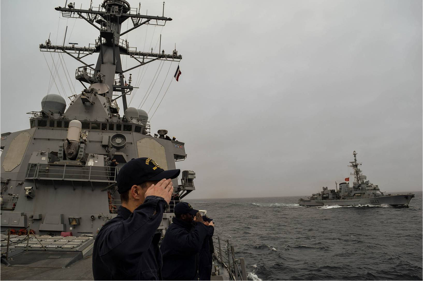 Les photos diffusées par l’US Navy montrent, au delà du salut traditionnel, que le destroyer américain a hissé dans sa mature le pavillon français, normalement hissé par courtoisie lors des escales...