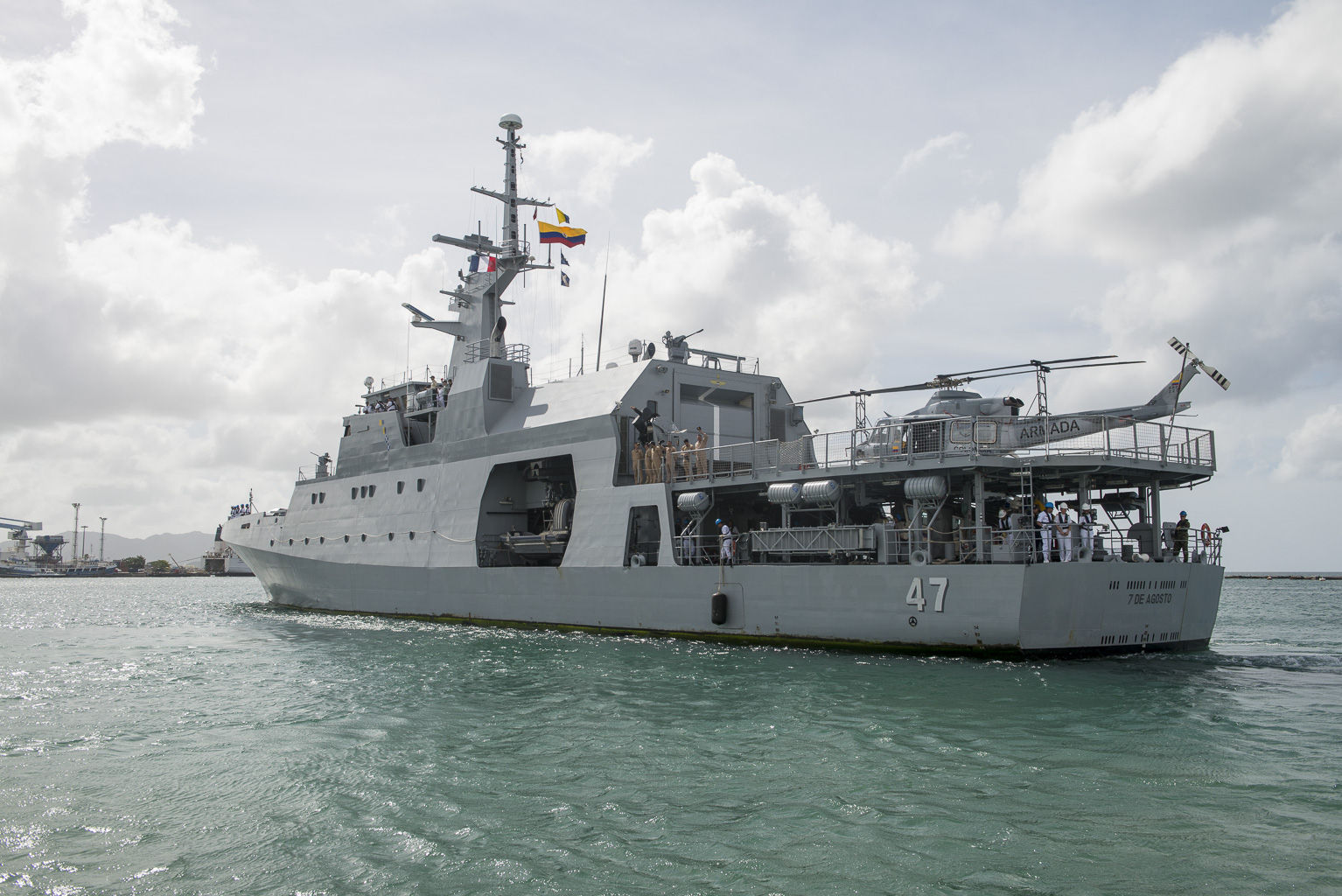 Du 15 au 17 novembre 2015, le bâtiment colombien 7 De Agosto a effectué une escale à la base navale de Fort-de-France. Dans le cadre de leur coopération militaire bilatérale, les forces françaises et colombiennes entretiennent un dialogue régulier visant notamment à renforcer leur coordination transfrontalière et régionale dans la lutte contre les trafics illicites et leur capacité d’engagement conjoint pour des opérations de secours d’urgence.