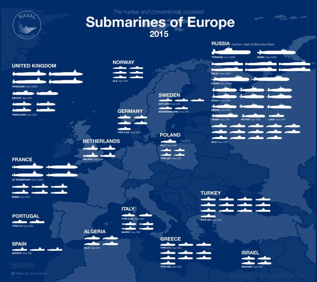 Cette carte montre les sous-marins basés en Europe et dans les mers qui l’entourent : depuis la mer Blanche jusqu’à la mer Noire, en passant par la Baltique et la Méditerranée.