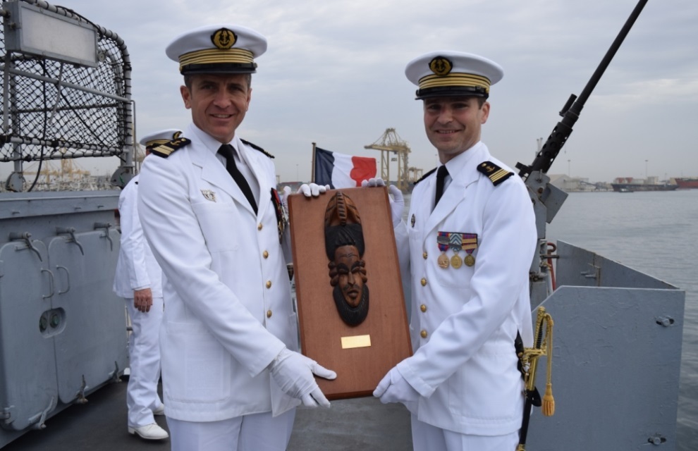 Le capitaine de vaisseau Benoit de Guibert, commandant le Mistral, de transmettre le flambeau de la mission Corymbe au capitaine de corvette Loïc Boyer, commandant du Commandant Birot