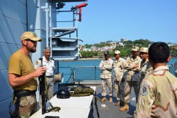 Le 27 avril, en escale à Sihanoukville dans le cadre de son déploiement en zone Asie du Sud-Est, le « Vendémiaire » a conduit un ensemble d’exercices à quai avec la marine cambodgienne. Pendant que les jeunes cadets de l’école royale des officiers visitaient le bâtiment, une trentaine de marins cambodgiens ont assisté à une démonstration du savoir-faire de l’équipage.