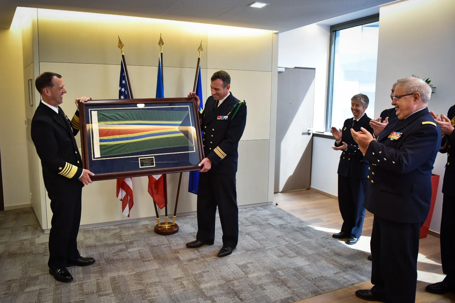 Au cours d’une cérémonie à Paris, le CNO a remis la flamme de la “Meritorious Unit Commendation” — rarement conférée à des unités étrangères — au capitaine de vaisseau Eric Malbrunot, commandant du porte-avions Charles de Gaulle. Le CNO a expliqué qu’il s’agissait d’un « symbole de la profondeur et du développement atteint par nos relations. »