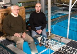 Les chercheurs de Georgia Tech, Peter Rogers, à gauche et Francois Guillot, font partie d’une équipe qui a développé un nouveau senseur qui mesure le déplacement créé par les ondes sonores sous l’eau. Il pourrait aider l’US Navy à détecter la présence de sous-marins ennemis.