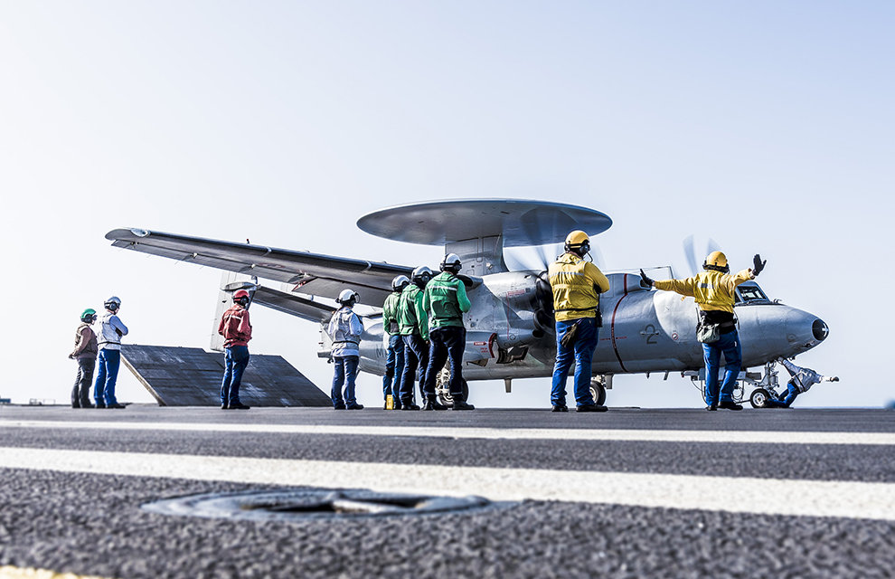 Sur le pont d’envol du porte-avions Charles de Gaulle, déployé avec son groupe aéronaval dans le cadre de l’opération Chammal, la silhouette peu commune des 2 avions E-2C Hawkeye intrigue. Cet aéronef particulier, propulsé par deux hélices et de puissants moteurs, est le seul avion de guet aérien avancé pouvant être embarqué. Focus sur cet « œil de faucon » essentiel dans les opérations menées depuis le porte-avions.