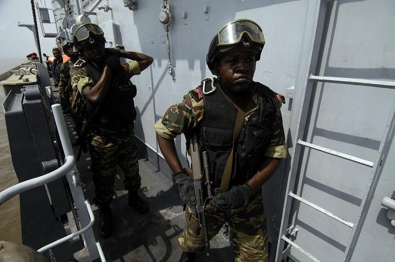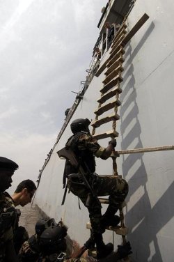 Des marins camerounais montent à bord du Germinal pour un entraînement à la visite de navires. Photo : US Air Force.