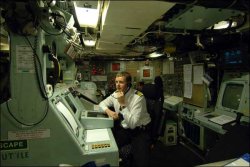 L’officier opérations Darren Mason utilise le périscope. Ce local est armé lors que le sous-marin se trouve à moins de 50 m et le périscope lui-même peut être utilisé lorsque le Vigilant est à une immersion de 23 m.