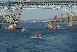 Le sous-marin nucléaire de recherche NR-1 est remorqué par le navire de soutien MV Carolyn Chouest alors que le sous-marin passe sous les ponts Gold Star Bridge et Thames River Draw. Photo : US Navy.