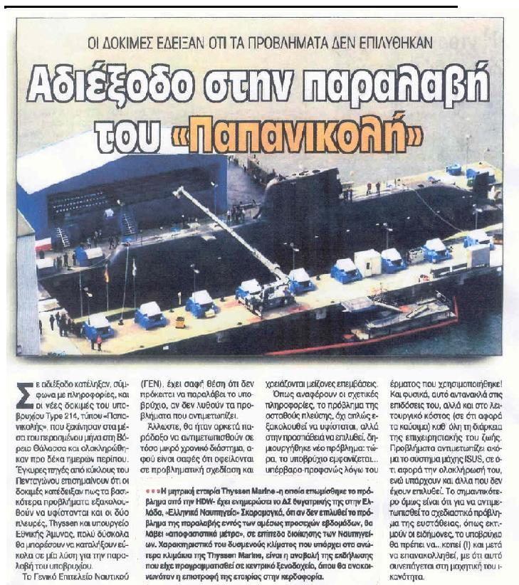 La compagnie-mère Thyssen-Marine – qui s’est chargé du problème pour HDW – a informé le conseil d’administration de sa filiale en Grèce, “Hellenic Shipyards” à Skaramangas, que si le problème d’acceptation n’était pas réglé dans les prochaines semaines, elle prendrait des “mesures décisives” au niveau de la gestion du chantier. Le report de la réception, qui avait été prévue dans un grand hôtel, au cours de laquelle le retour de la compagnie dans les profits, devait être annoncé, est la preuve du climat difficile qui reigne dans la haute direction de Thyssen Marine.