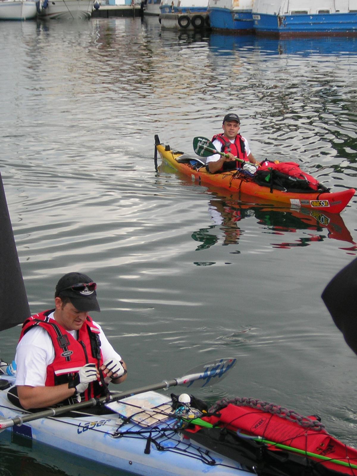 Enfin, le moment du départ est arrivé. Les 2 marins ont mis leur kayak à l’eau et ont embarqué. Auprès les derniers au-revoir, ils se sont éloignés, accompagnés par 2 de leurs collègues sur un kayak bi-place. Leurs épouses avaient embarqué sur une vedette de la SNSM qui les a accompagné jusqu’à l’entrée du port de St-Mandrier.