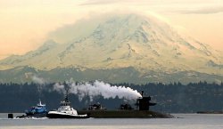 Le SNLE USS Alabama de la classe Ohia a été déplacé dans le sound par une flottille de remorqueurs, avec le Mont Rainer à l’arrière-plan. © M. Anthony Madina / US Navy