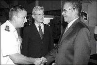 Le commandant Vincent Gregoire (Ã gauche) accueille le premier ministre Bruce Golding (Ã droite) en présence de l’ambassadeur de France.