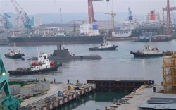 Le premier U-214 AIP de Corée du Sud, le Sun Won Il, entouré de remorqueurs à Ulsan. © TKMS