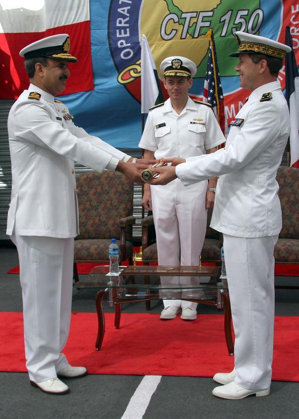 La cérémonie concluait la deuxième période pendant laquelle la marine pakistanaise a assuré le commandement de la CTF 150, qui effectue des opérations de sécurité maritime dans le golfe d’Aden, dans le golfe d’Oman, en mer d’Oman, en mer Rouge et dans l’océan Indien.