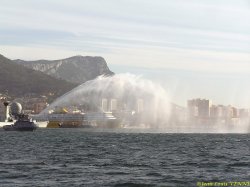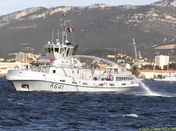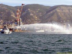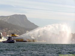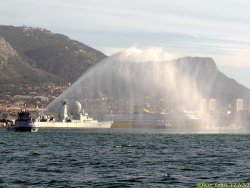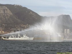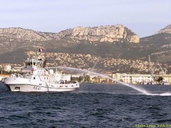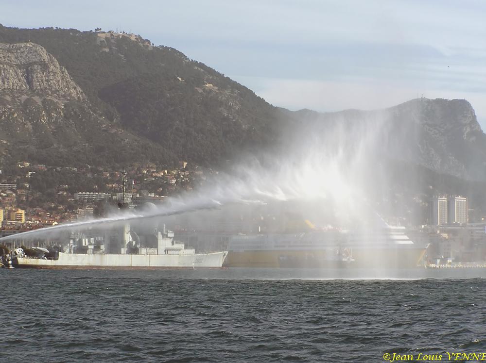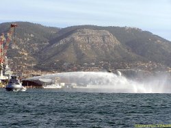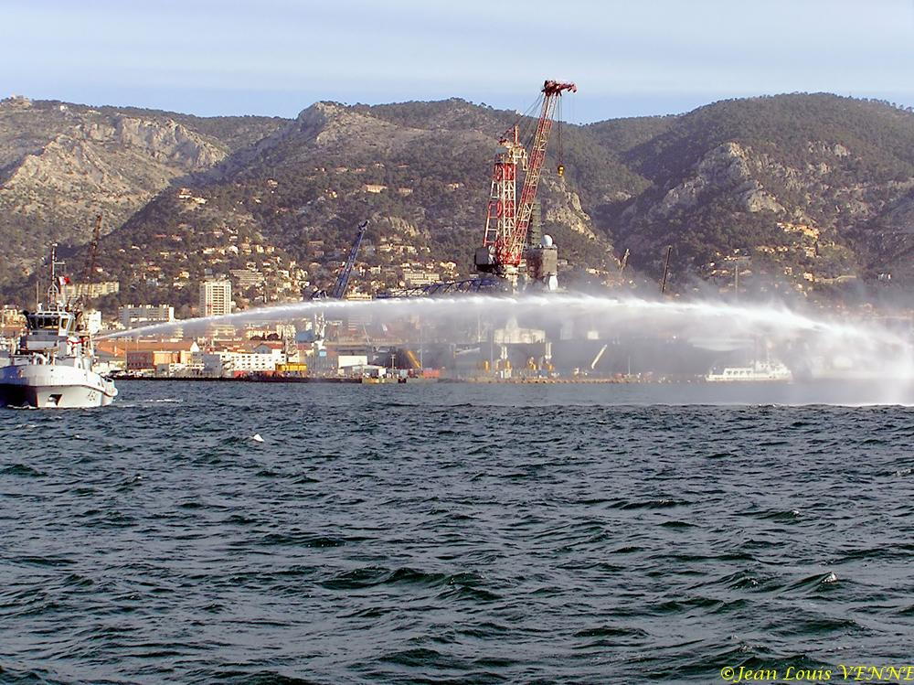 Le remorqueur Estérel teste son canon à eau en petite rade de Toulon, avec le porte-avions Charles de Gaulle en arrière-plan.