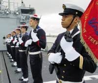 Des marins français sur le pont arrière du Latouche-Tréville à Portsmouth.