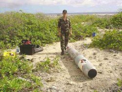 L’adjudant Lalloyau du groupe NEDEX près de la torpille découverte à Tahaena (archipel des Tuamotu).