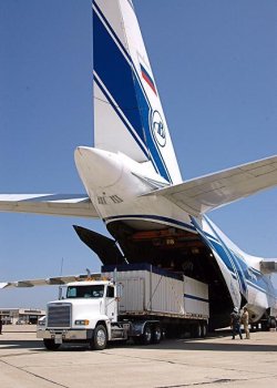 Le personnel de soutien charge du matériel à bord d’un Antonov russe en prévision de l’exercice Bold Monarch 2008. © Patrick D. House / US Navy