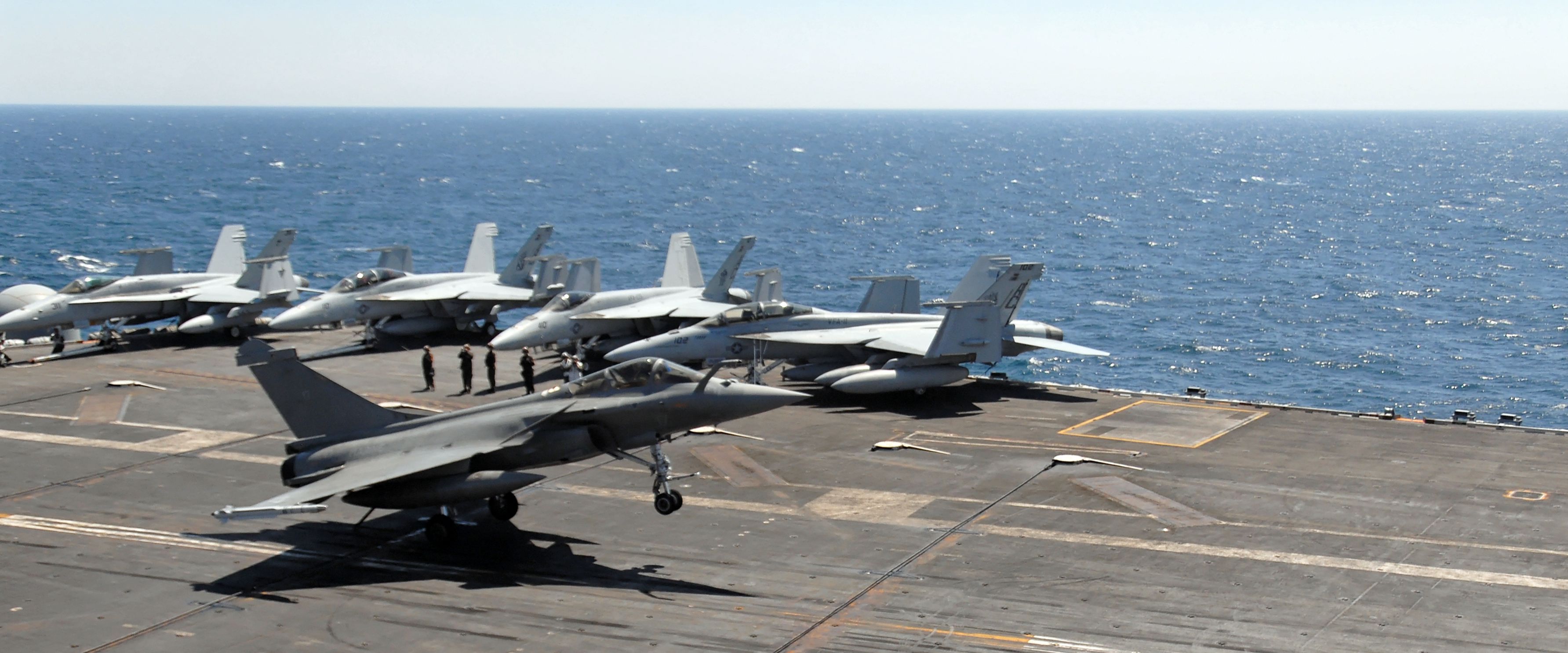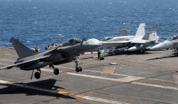 La marine nationale (CECMED) vient de diffuser des photos des appontages et des décollages effectués ce mercredi par 3 Rafale et 1 Hawkeye sur le porte-avions américain USS Harry Truman.