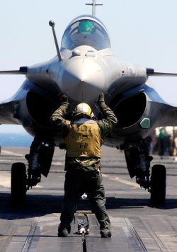 Un directeur de pont d’envol guide un Rafale de la marine nationale vers l’une des catapultes du porte-avions USS Harry S. Truman. © Ricardo J. Reyes / US Navy