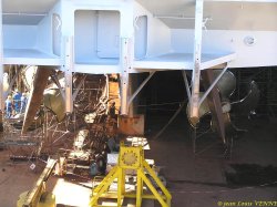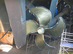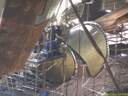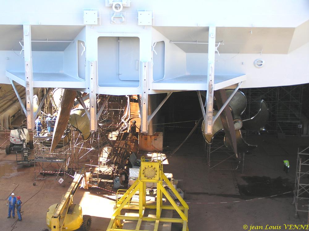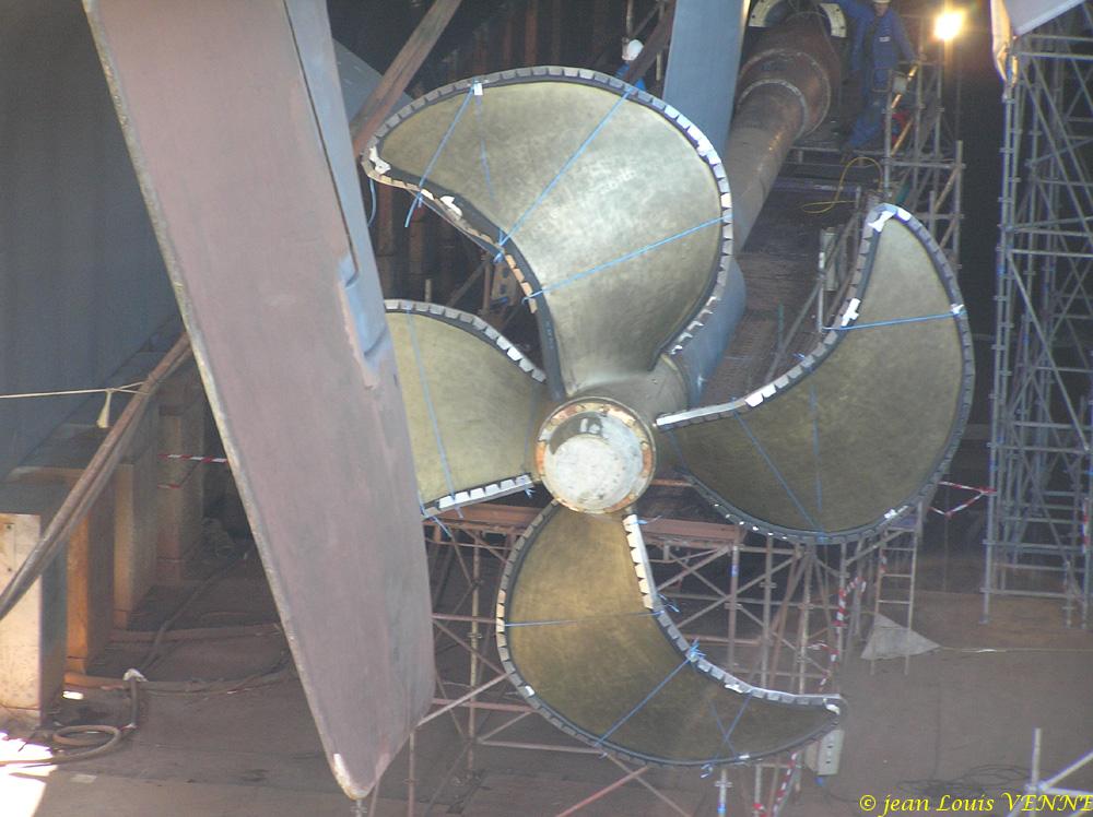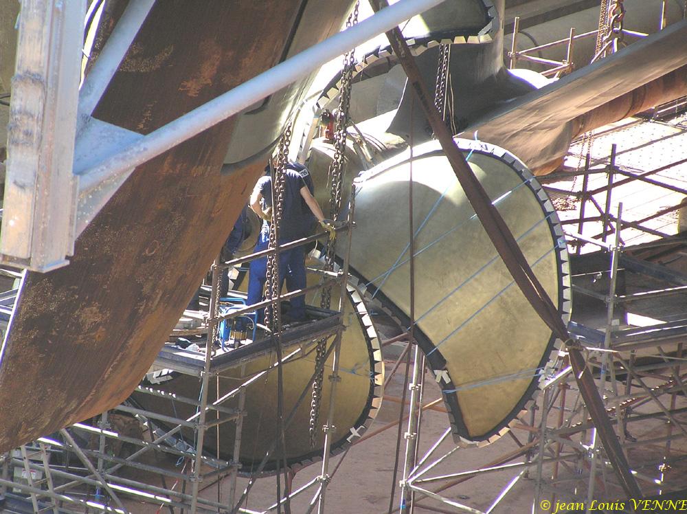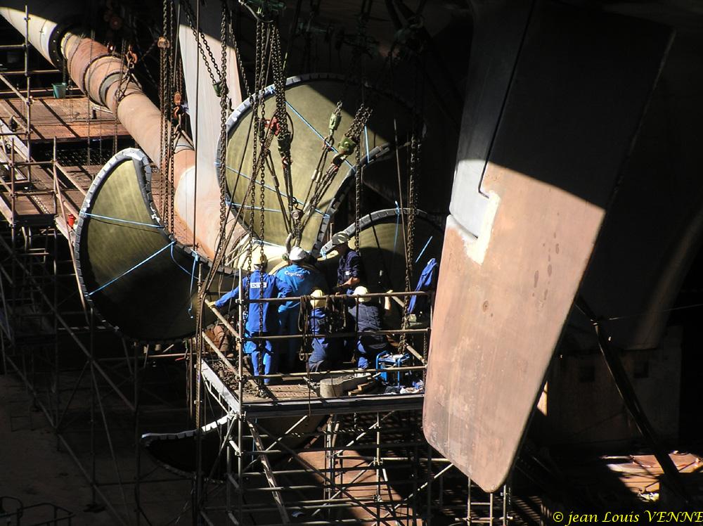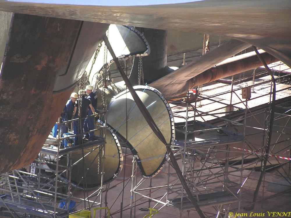 Les spécialistes étaient en train de positionner l’hélice bâbord à l’aide de nombreux palans hydrauliques, ces derniers fixés sur la coque. Après avoir pris des repères, l’hélice a ensuite été extraite de son arbre pour effectuer divers réglages.