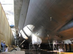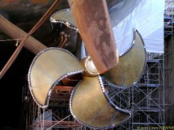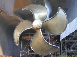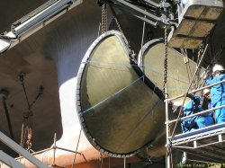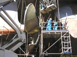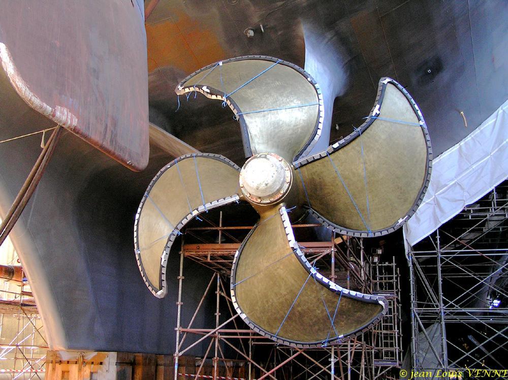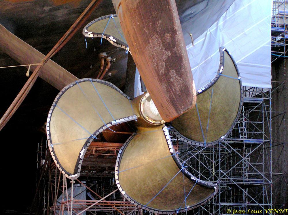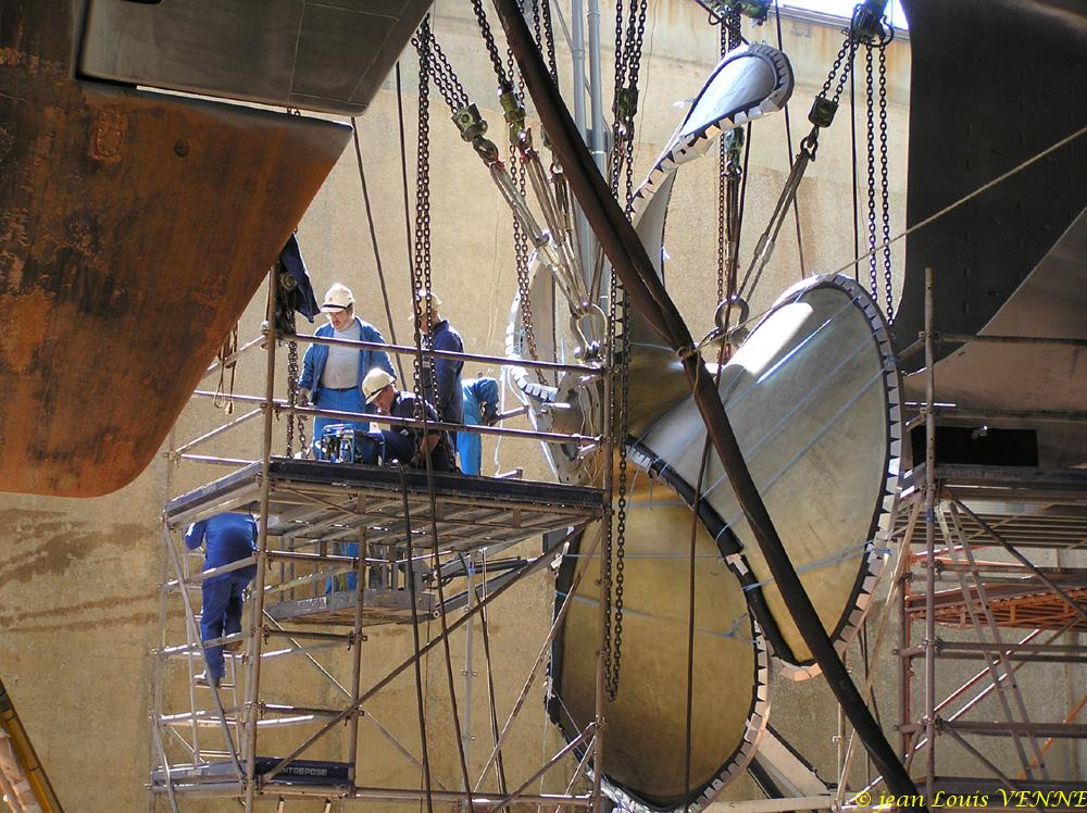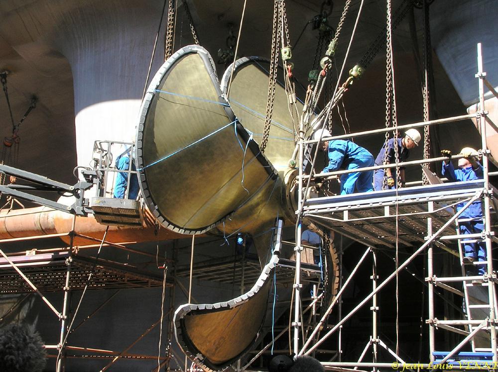 Les spécialistes étaient en train de positionner l’hélice bâbord à l’aide de nombreux palans hydrauliques, ces derniers fixés sur la coque. Après avoir pris des repères, l’hélice a ensuite été extraite de son arbre pour effectuer divers réglages.