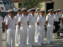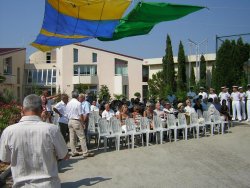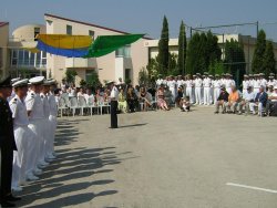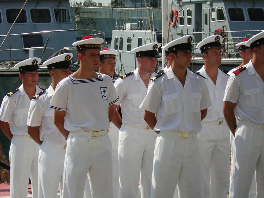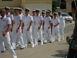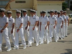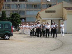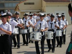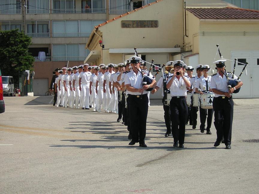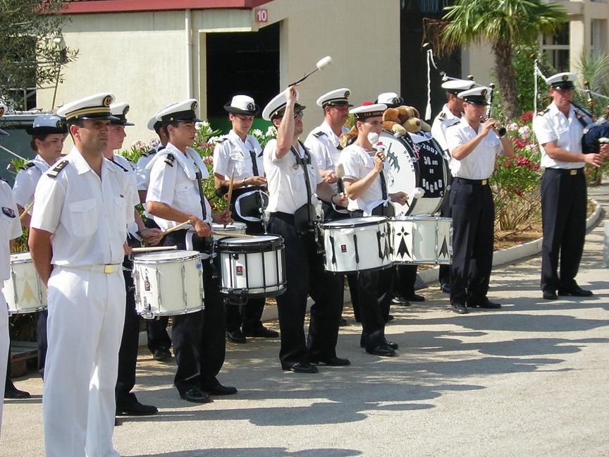 La cérémonie a commencé lorsque, sous un soleil éclatant — quel dépaysement pour les familles tout juste arrivées de Bretagne —, les nouveaux plongeurs démineurs sont arrivés, précédés par le bagad du CIN St-Mandrier.