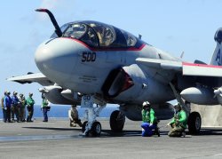 Des personnels de pont d’envol français et américains préparent un EA-6B Prowler pour son lancement pendant des qualifications franco-américaines sur porte-avions à bord du porte-avions américain USS Theodore Roosevelt. Il s’agit des premières qualifications communes franco-américaines sur un porte-avions américain. © Christopher Hall / US Navy