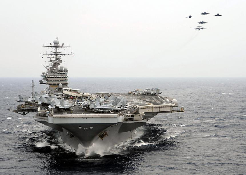 Des Rafale Marine français et des F/A-18 Super Hornet américains effectuent un survol à basse altitude au-dessus du porte-avions américain USS Theodore Roosevelt. ©Jonathan Snyder / US Navy